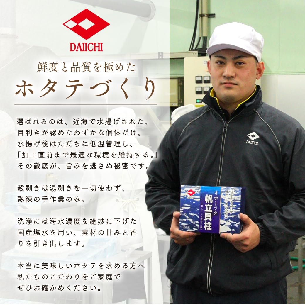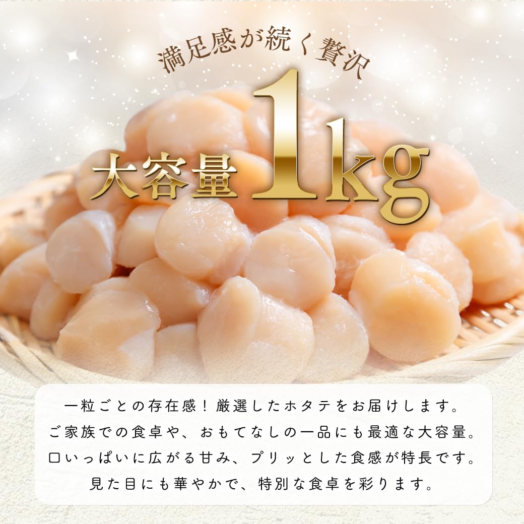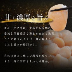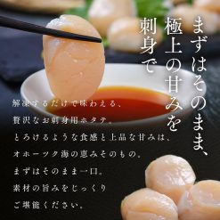 詳細: 発送時期:3月中旬以降順次発送 オホーツク海のホタテはグリコーゲンが多いため、甘味が強くサクサクとした食感が特徴です! HACCP(ハサップ)の徹底した衛生管理のもと、オホーツク海で厳選された新鮮なホタテ貝柱を急速冷凍しました。とれたての旨味と食感がお楽しみいただけます。 ■こだわり1 鮮度最優先!漁師厳選のホタテを近場の漁場から仕入れ、速やかに冷蔵保管します。機械の湯剥きだと鮮度が落ちてしまうため、手作業での剥き加工にこだわり鮮度を最優先しています!冷凍保管も大きな倉庫を使用し、ゆったりとした品質重視の保管をしています。 ■こだわり2 味にもこだわっています!ホタテの洗浄にはあえて海水を使わずに、国産の塩を使用した塩水を使っています。食べる時にちょうど良く感じる塩分濃度に調整しているから甘みが引き立ちます! スーパーでは簡単に手に入らないクオリティを提供したいという製造者の思いを、是非食べて実感してください! ■おすすめの食べ方 食べる量だけラップなどに包んで冷蔵庫でじっくり解凍してください。 お刺身はもちろんのこと、冷凍のホタテ貝柱は油との相性が抜群です!カルパッチョやフライ、バター焼きなど様々な料理にお使いいただけます! 【返礼品の注意事項】 ※令和7年10月15日より寄附金額が改定されました。 ※画像はイメージです。 ※貝類には鮮度と関係なく菌が付着している場合があります。体調がすぐれない方が召し上がると中毒症状が現れる可能性もございます。 ※召し上がって体調を崩された場合でも、提供元・自治体は責任を負いかねます。