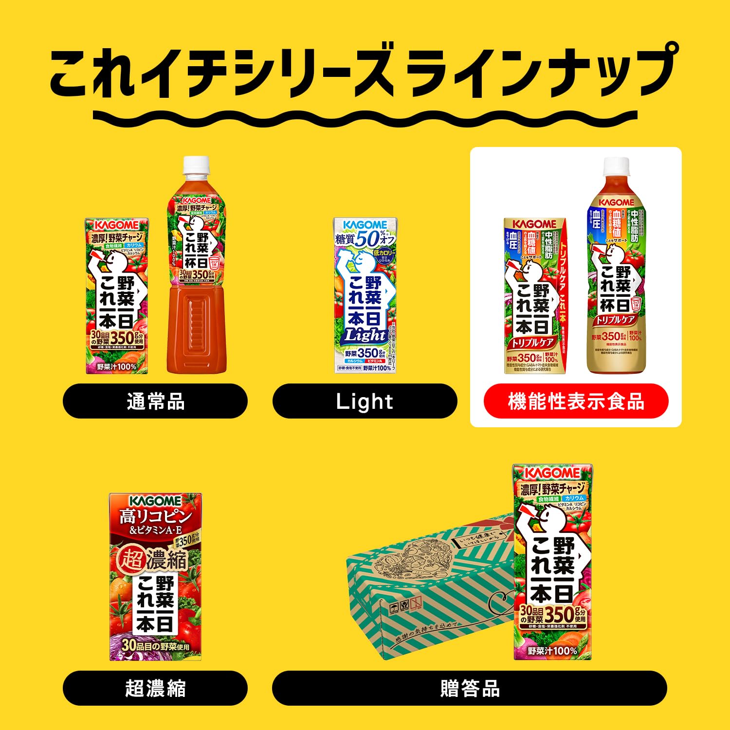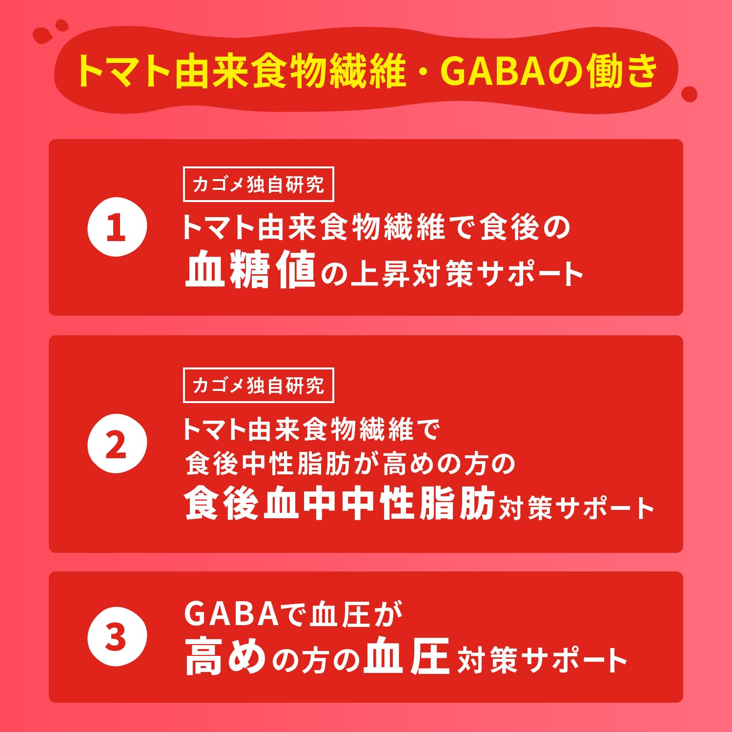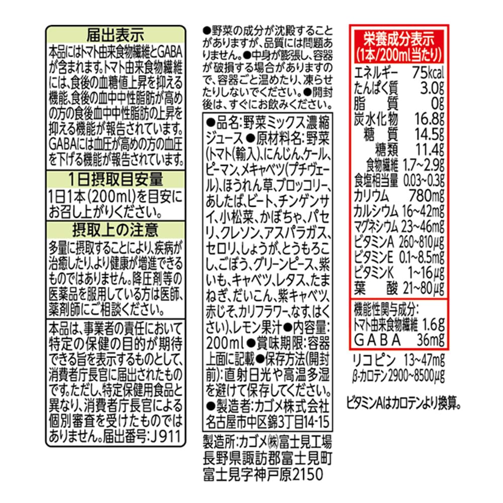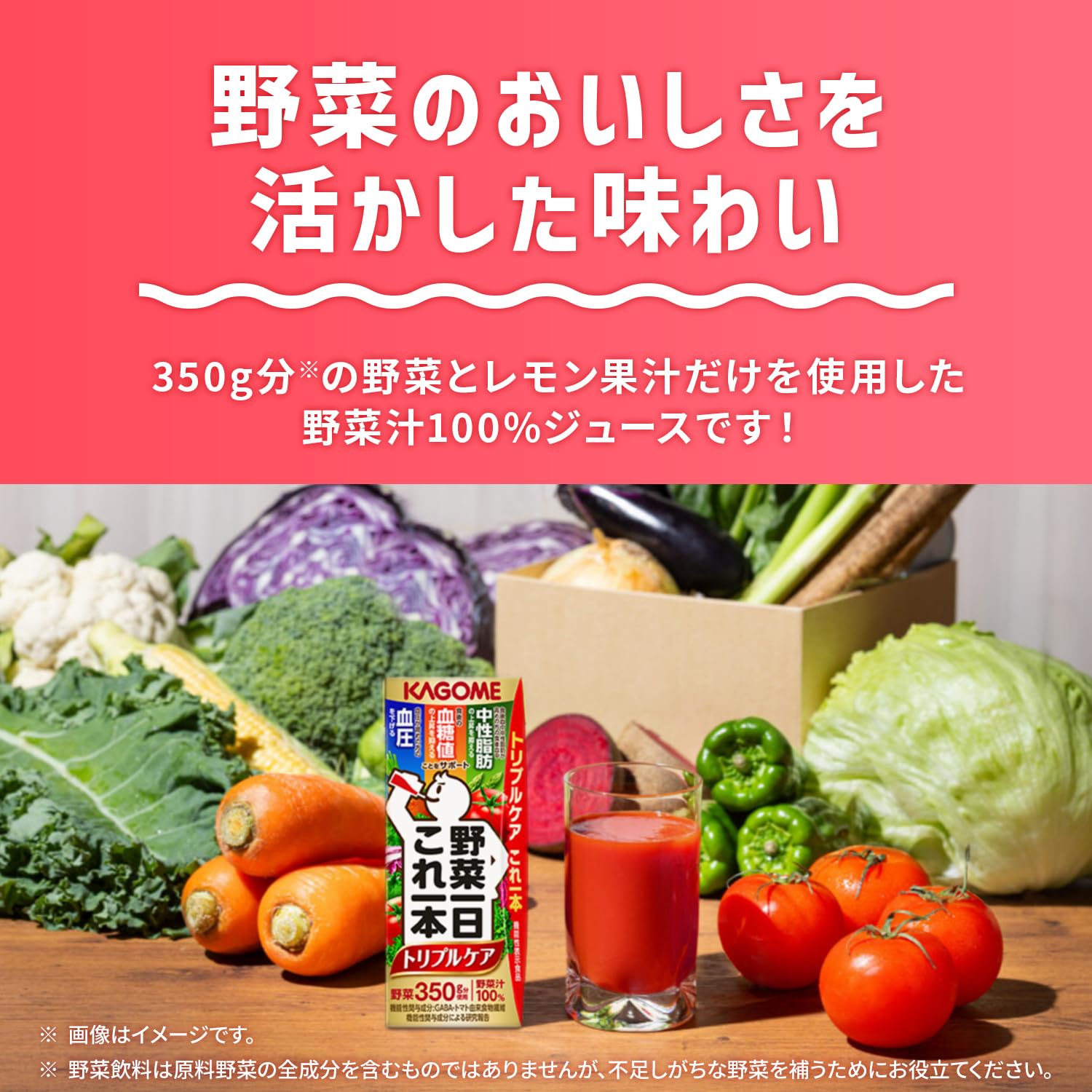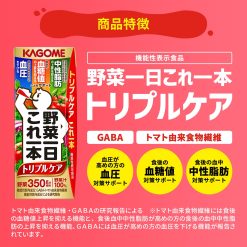 カゴメ 野菜一日これ一本トリプルケア200mlは、野菜一日これ一本トリプルケアは機能性表示食品です。本品にはトマト由来食物繊維とGABAが含まれます。トマト由来食物繊維には、食後の血糖値上昇を抑える機能、食後中性脂肪が高めの方の中性脂肪の上昇を抑える機能が報告されています。GABAには血圧が高めの方の血圧を下げる機能が報告されています。血糖値や中性脂肪、血圧が気になる方におすすめです。1日1本(200ml)を目安にお召し上がりください。