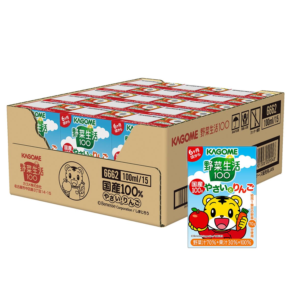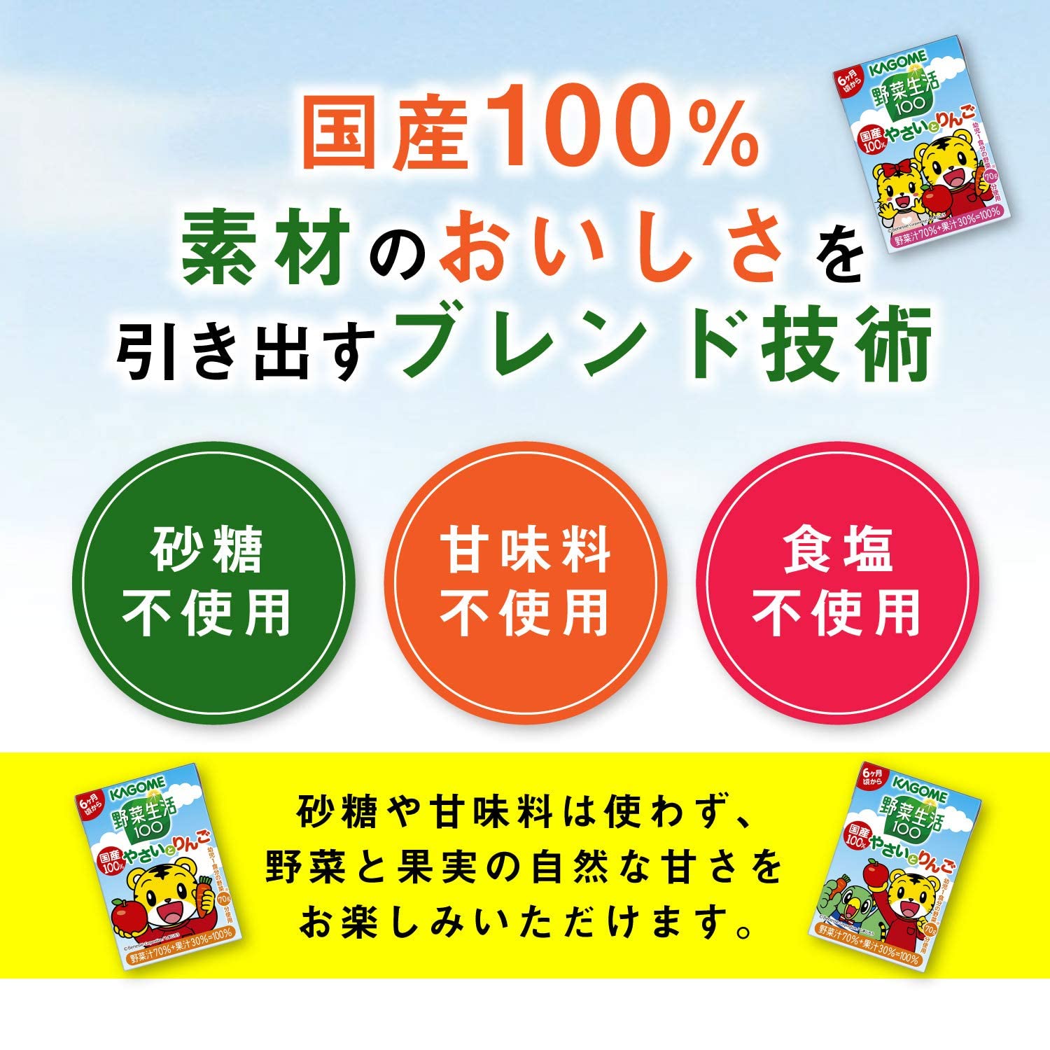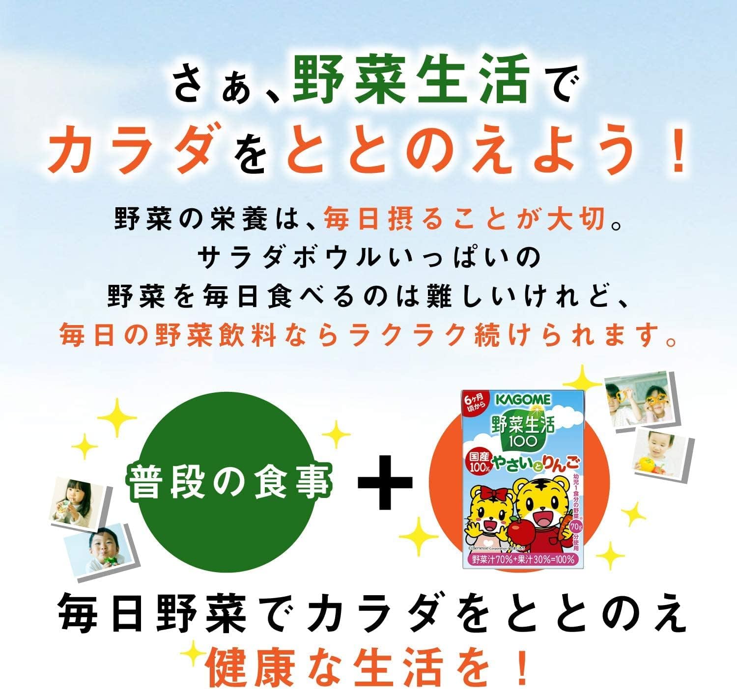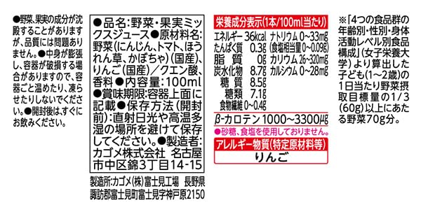 カゴメ 野菜生活100 国産100%やさいとりんご100mlは、国産の野菜と果実を使用した、子供が好きなりんご味の野菜・果実ミックスジュースです。飲み切りやすい100mlサイズ。