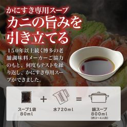 - かにすき専用スープ3袋付き! 老舗調味料メーカーと共同開発した、かにすき専用スープ。十倍希釈となりますので、1袋80mlに対して水720mlで薄めていただくと、市販のストレートタイプと同じ800mlの鍋スープができます。