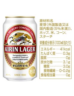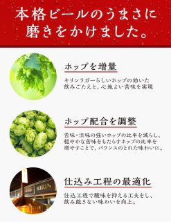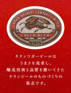 - 約マイナス1℃の低温でじっくりと熟成させて、おいしさをたっぷりと引き出してつくられるキリンのラガービール。ホップの量・質・投入時期にこだわった独自の製法で、深いコクと力強い飲みごたえを実現。