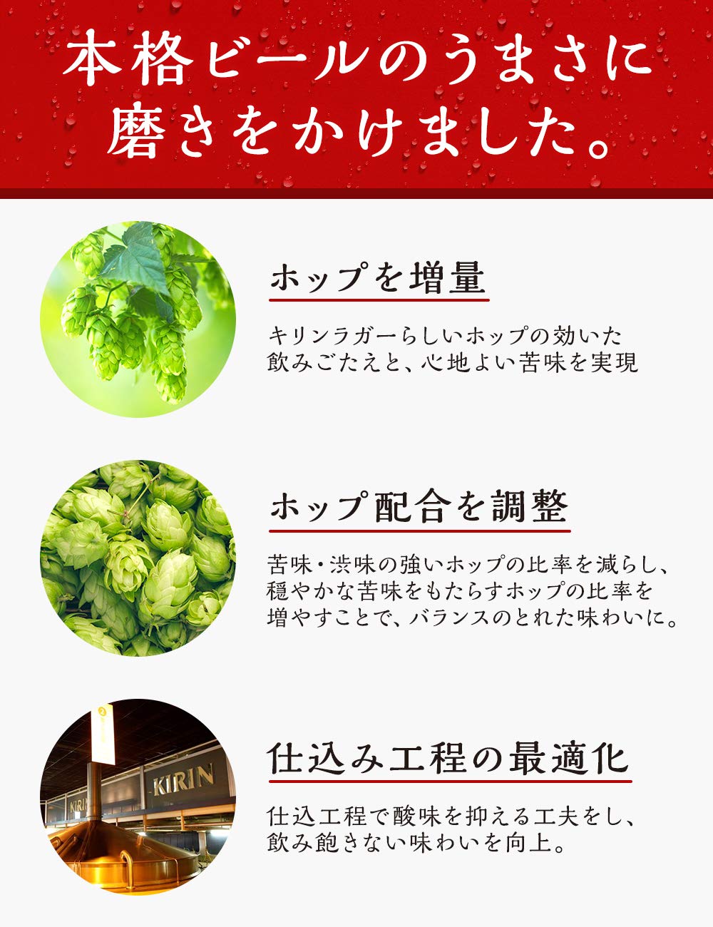 - ホップの効いた飲みごたえと締まりのある後味の、飲み飽きないうまさ。キリンラガーらしい飲みごたえ・苦味はそのままに、酸味や雑味が突出した印象を抑えることで、よりバランスのとれたうまさへと進化しました。
