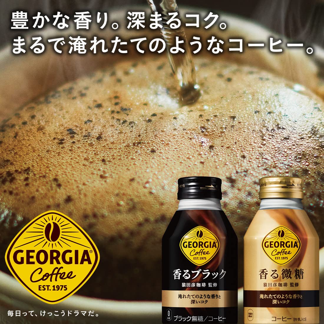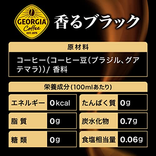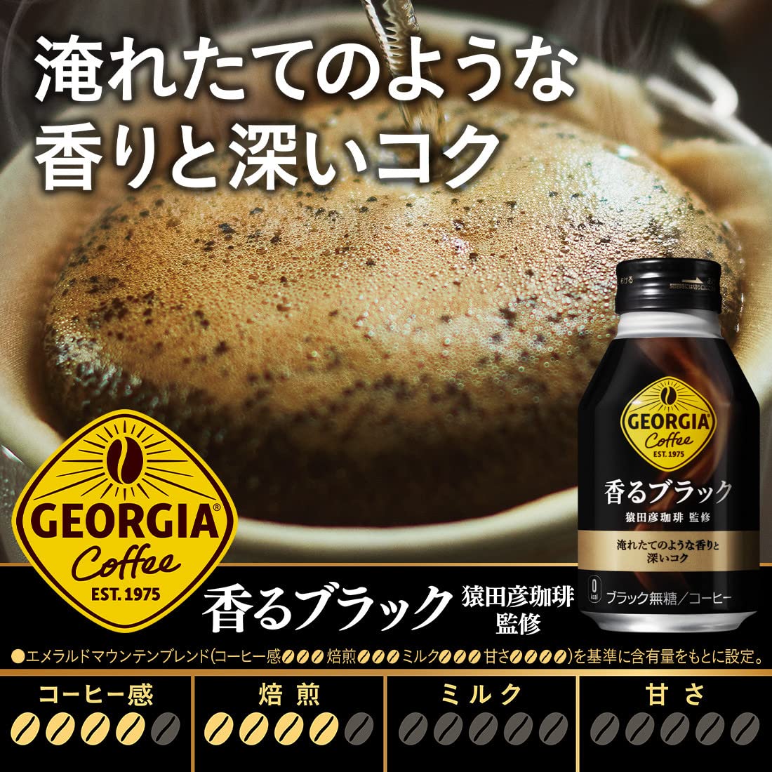 挽きたてのコーヒー豆の香りを封じ込める日本初の「挽きたてアロマ製法」と、ボトル缶の広口形状と高い密封性を活かし、淹れたてのようなコクと香りにこだわった「ジョージア 香るボトル缶シリーズ」。『ジョージア 香るブラック』は、従来の「挽きたてアロマ製法」に加え、ハンドドリップで行われる“蒸らし”の工程を取り入れることで、さらに香り高いコクと深みのある味わいを実現したブラックコーヒーです。飲んだ後に、もどってくる「もどり香」もお楽しみください。