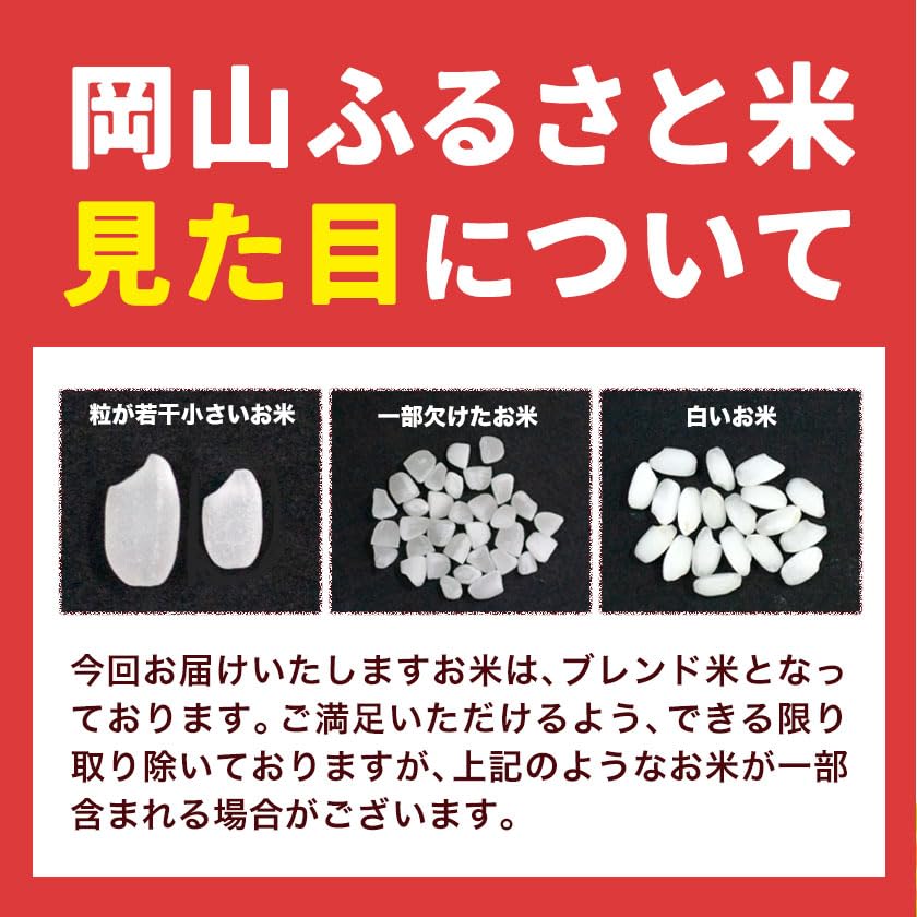 商品情報:岡山ふるさと無洗米 名称:無洗米 使用割合:複数原料米 国内産 10割 (岡山県産 10割) 内容量:10kg(5kg×2袋) 精米年月日:米袋に記載 賞味期限:お早めにお召し上がりください。 保存方法:冷暗所や冷蔵庫などで保存してください。 ※画像はイメージです。