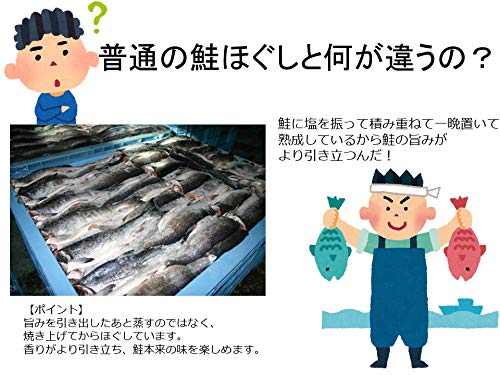 国産の秋鮭を塩漬け熟成し、じっくりと焼き上げた後、丁寧に手作業でほぐしました。鮭本来の美味しさを味わえる昔ながらの鮭ほぐしです。