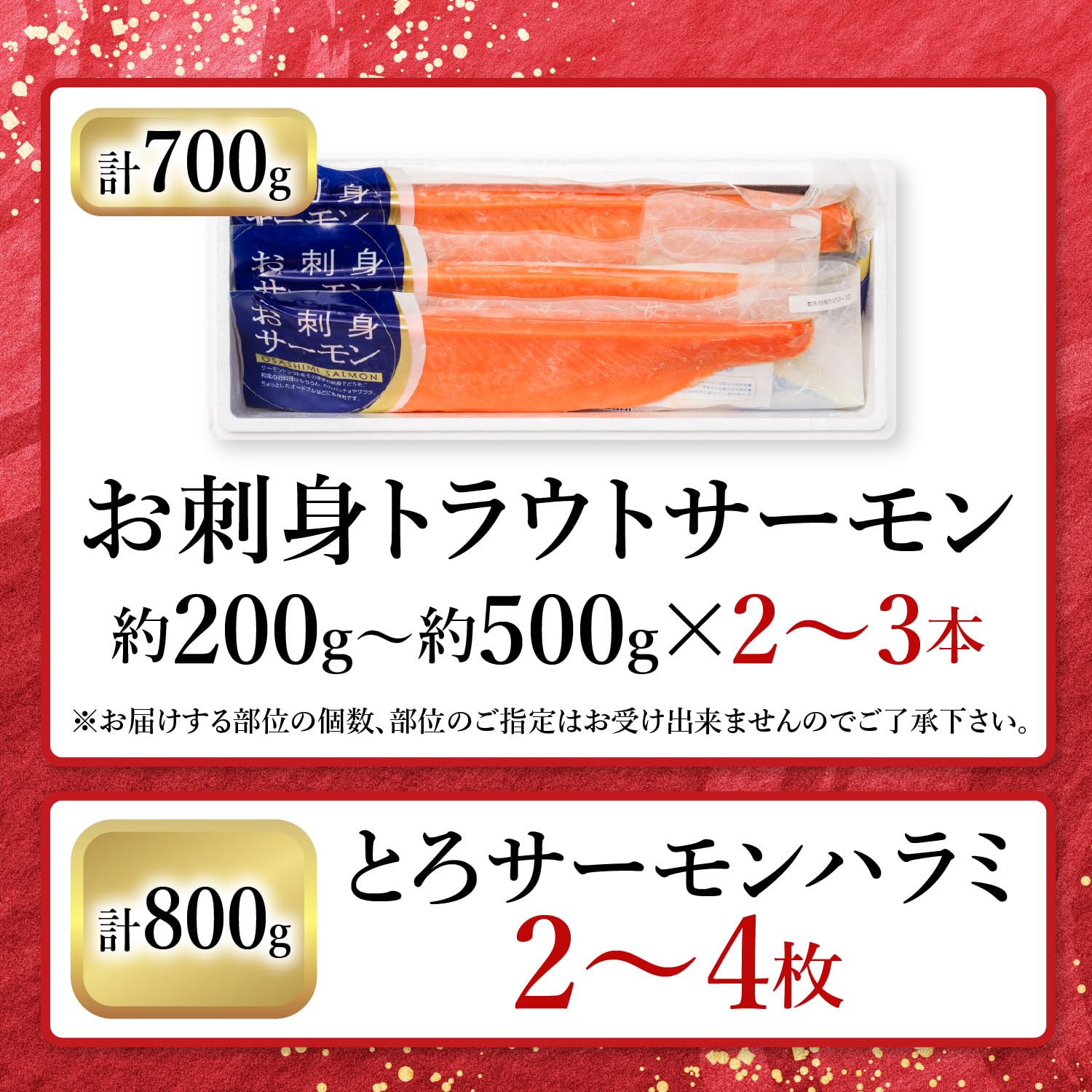 - 【内容量】お刺身トラウトサーモン700g(約200g~約500g×2~3本)※お届けする部位の個数、部位のご指定はお受け出来ませんのでご了承下さい、とろサーモンハラミ800g(2~4枚)