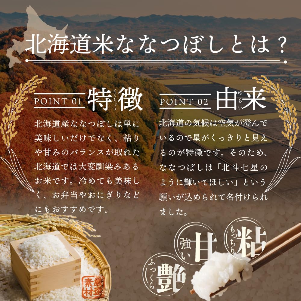 米・食味鑑定士監修!北海道 空知三笠の美味しいななつぼしをご賞味下さい! ななつぼしは単に美味しいだけではなく、粘りや甘みのバランスが取れた北海道では馴染みのあるお米です。 冷めても美味しく、お弁当やおにぎりなどにもおすすめで、ふっくらとした食感・味・つや・香りなどにとても優れたお米です。 米・食味鑑定士監修。