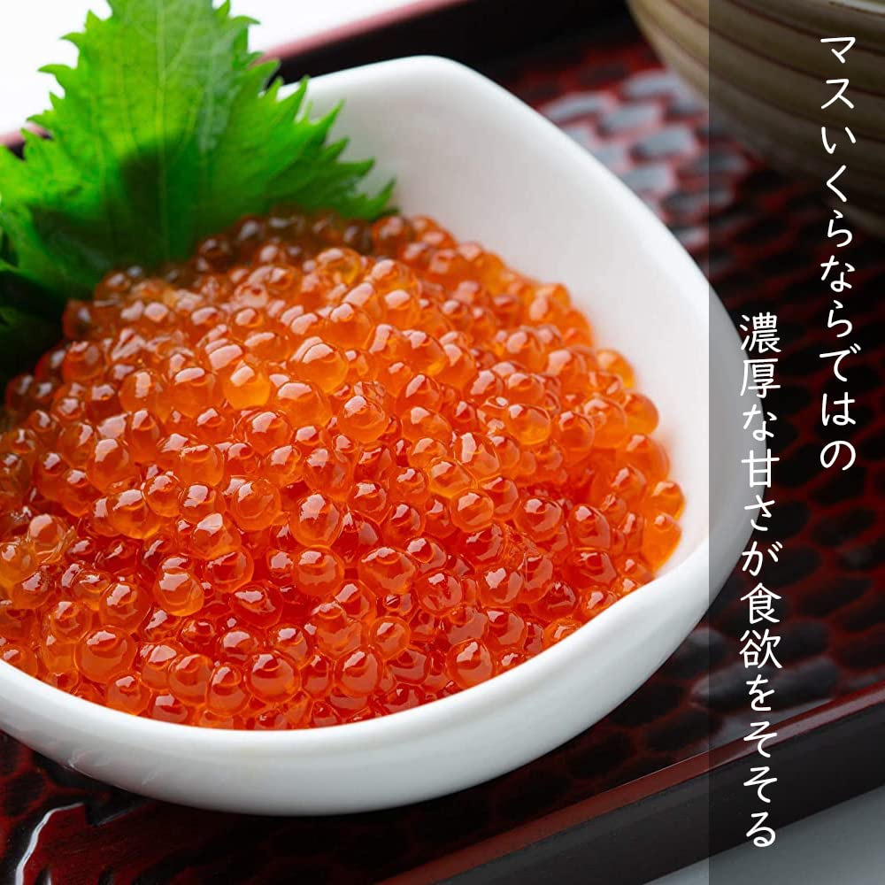 - 【マスいくらならではの濃厚な甘さが食欲をそそる】サケいくらにくらべるとマスいくらは若干粒の大きさが小さくなりますが、サケいくらよりも甘みが強く濃厚。皮が薄いので舌に皮が残りにくいのも特徴です。マスいくらの滑らかな舌触りと濃厚な甘さを味わったらもう箸が止まりません。