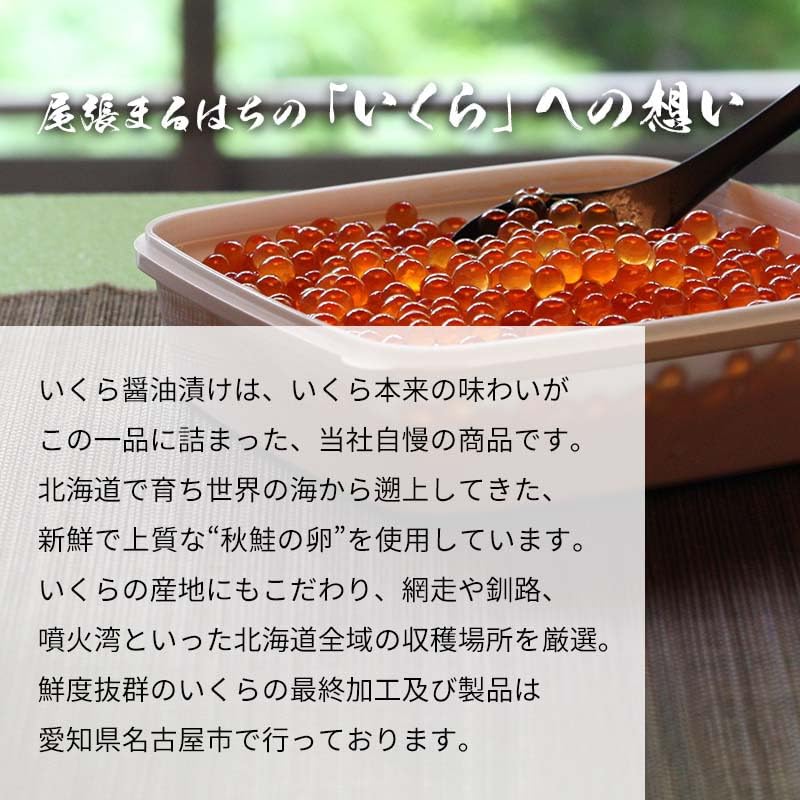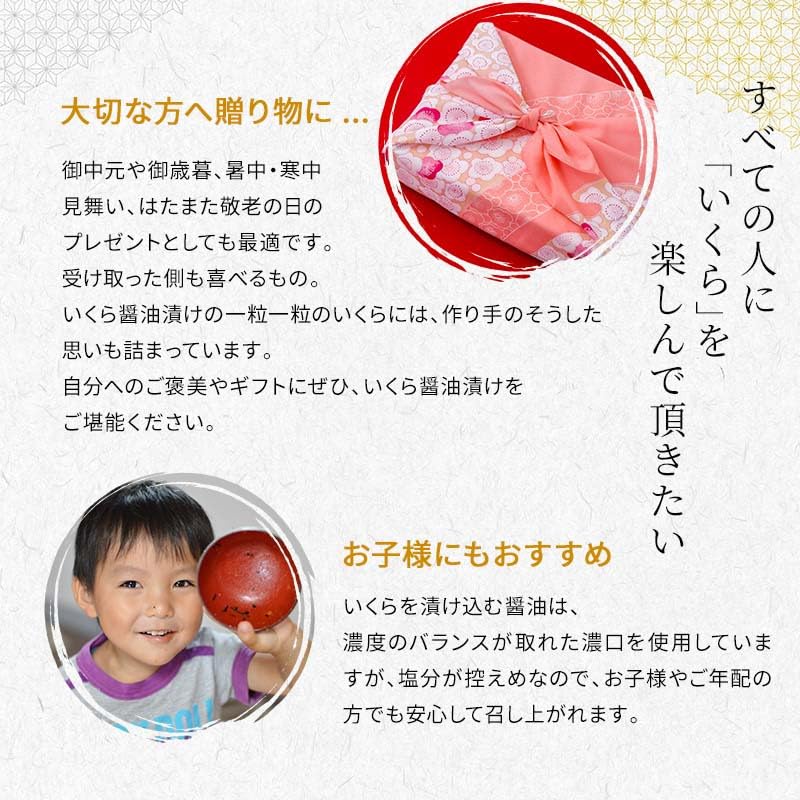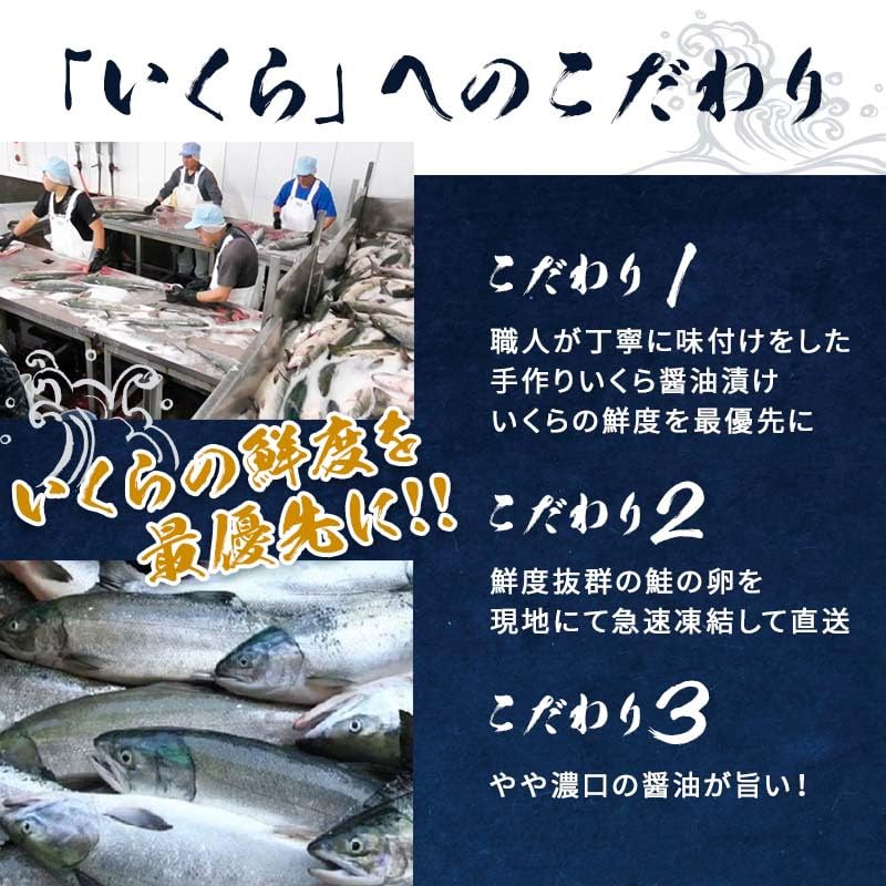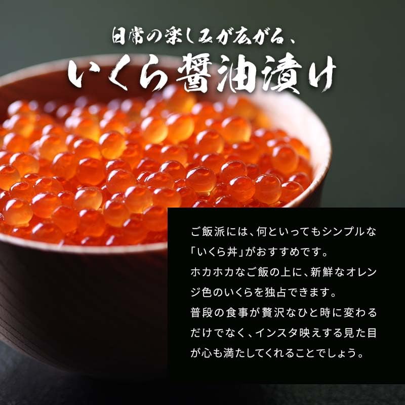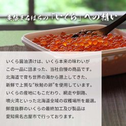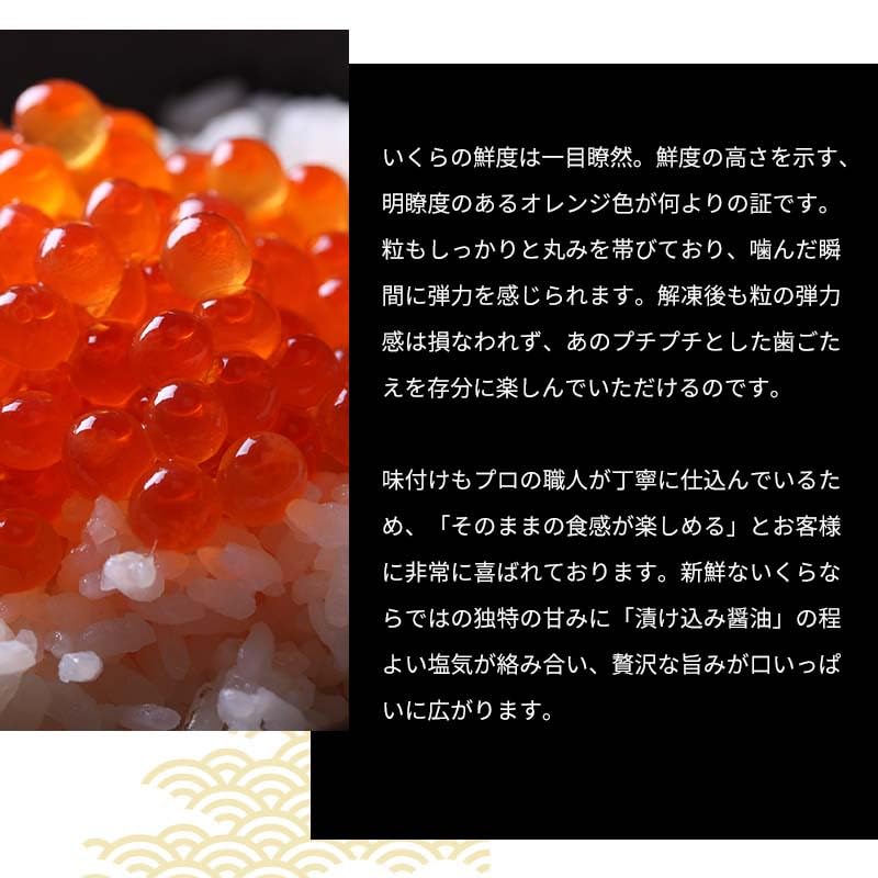 - 【お家で食べる美味しいイクラで思わず笑顔に】ワンランク上の美味しさを実現するために、北海道に回帰してきた白鮭(シロザケ)を漁獲し、徹底したチルド管理の下、素早く原卵を選別しています。また、?油漬けの味付けもプロが丁寧に仕上げています。シーズン毎により良いイクラの産地を選んで直接買付けもしているので、最初から最後まで品質や味付けにまでこだわった逸品です。お家にいながらにして上質なイクラを味わえるので、食べたら思わず笑顔になります。