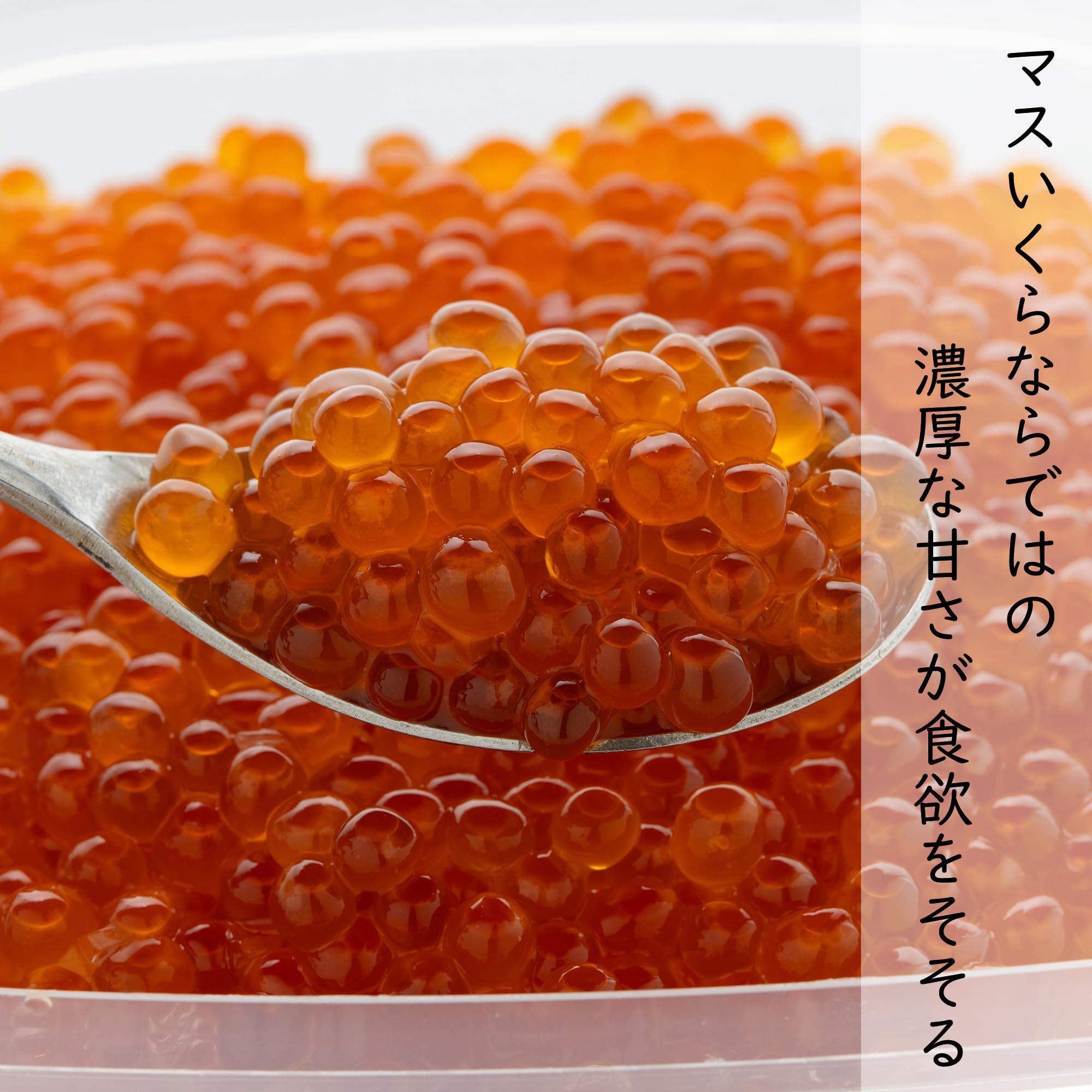 - 【マスいくらならではの濃厚な甘さが食欲をそそる】サケいくらにくらべるとマスいくらは若干粒の大きさが小さくなりますが、サケいくらよりも甘みが強く濃厚。皮が薄いので舌に皮が残りにくいのも特徴です。マスいくらの滑らかな舌触りと濃厚な甘さを味わったらもう箸が止まりません。