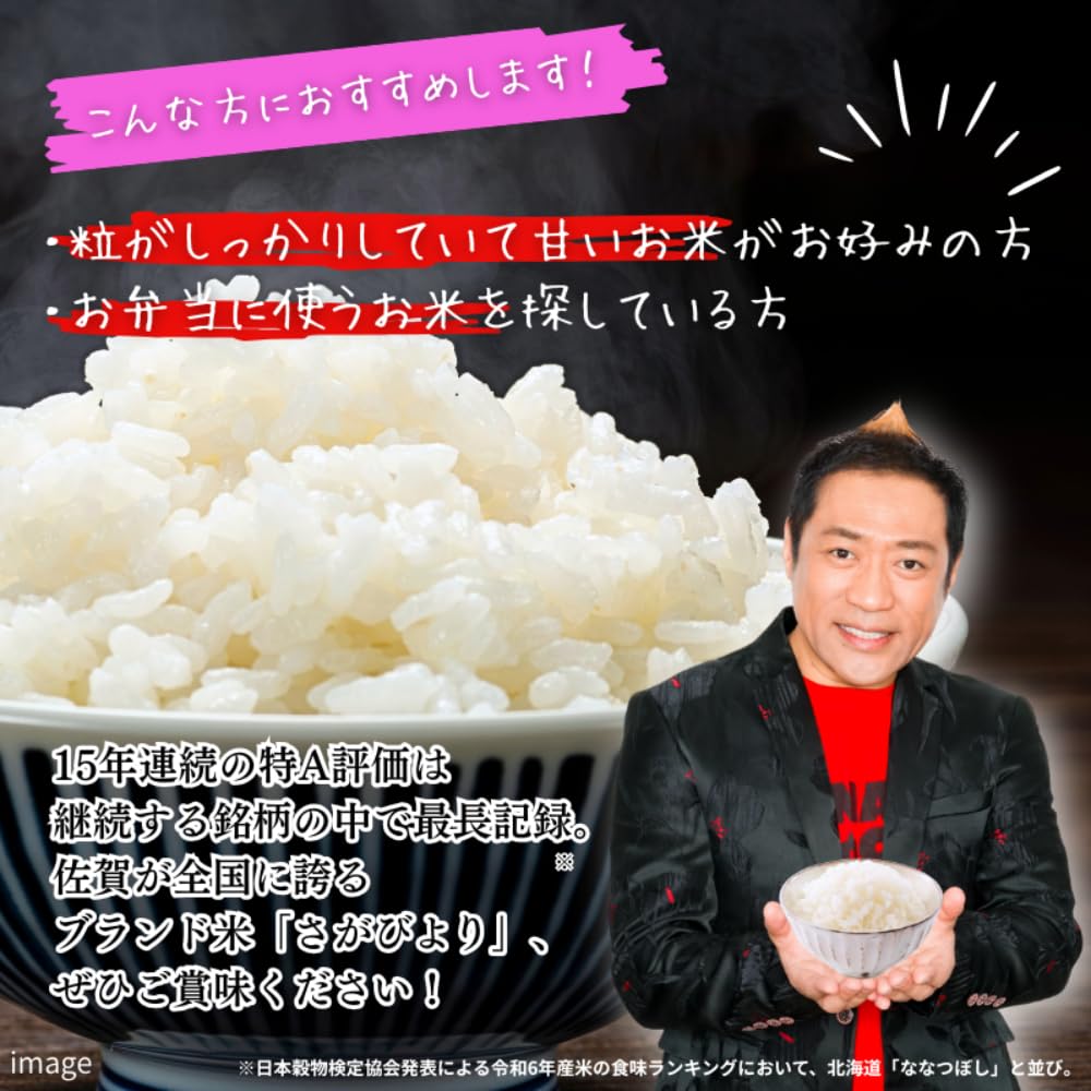 佐賀平野の豊かな土壌で育ち、日本穀物検定協会が行っている「米の食味ランキング」で、最高ランクの“特A評価”を獲得した人気のお米「さがびより」粒が大きく、もっちりした食感で甘みや香りがあるのが特徴です。 ※特A認定は商品そのものの評価ではございません。 ※品質保持の為なるべく涼しい所で保管して頂き、精米日後1ヶ月程でお早めにお召し上がり下さい。 ●お米の保管の注意点● 1.風通しがよい冷暗所に保管してください。 2.密閉容器(ペットボトルなども可)に入れ替えて保管してください。 3.米びつ容器をこまめに掃除してください。 4.2~3週間以内で食べきれる量をお選びください。(特に夏場) 【!注意事項!】 ※配送日の指定は承っておりません。 ※天候や収穫状況により、お届けや規格が変更になる場合がございます。 ※画像はイメージです。画像のものと多少異なる場合があります。 ※返礼品お受取り後、すぐに品の状態をご確認いただき、賞味期限及び消費期限をお守りください。 ※発送には万全を期しておりますが、万が一、外装破損、異物、汚れ等があった場合は、お早めに(一社)佐賀市観光協会(TEL:0952-20-1107 Mail:furusato@sagabai.com)までご連絡ください。 尚、お受け取りから2週間過ぎてからの対応は致しかねます。