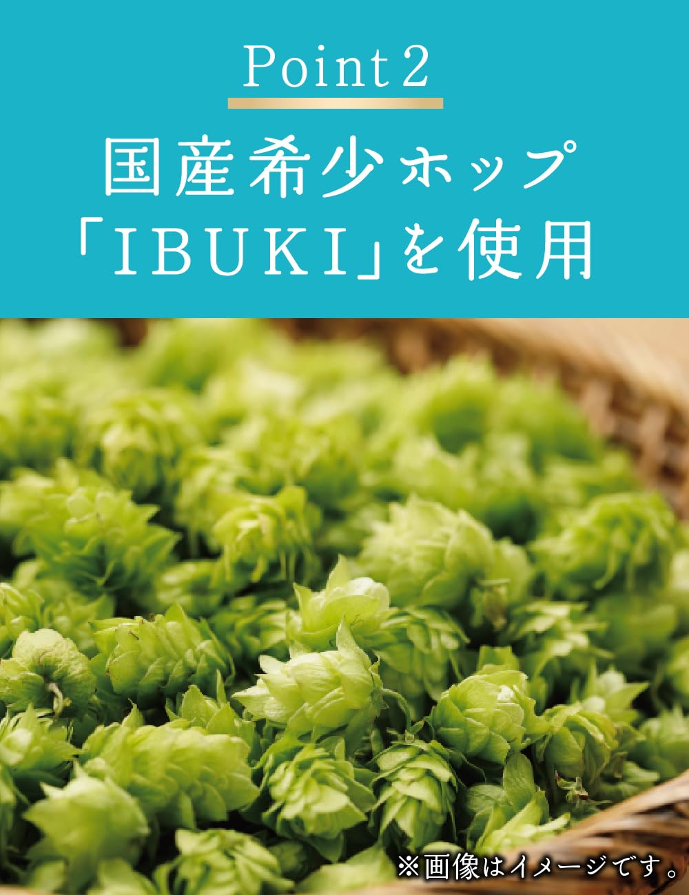 【麦の豊かなうまみ】麦芽とホップと水だけ、ビール特有の酸味を抑え、豊かな味わいを実現。国産希少ホップ「IBUKI」使用、爽やかな柑橘香を楽しめる。