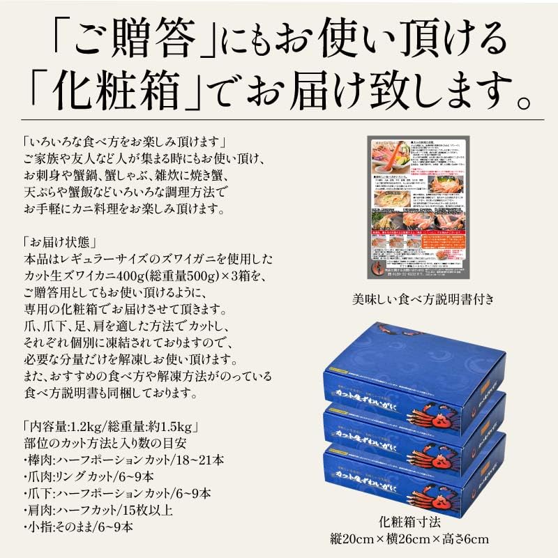 - 【お届け状態】本品はレギュラーサイズのズワイガニを使用したカット生ズワイカニ4g(総重量5g)×3箱をご贈答用としてもお使い頂けるように専用の化粧箱でお届けさせて頂きます。爪、爪下、足、肩を適した方法でカットし、それぞれ個別に凍結されておりますので、必要な分量だけを解凍しお使い頂けます。