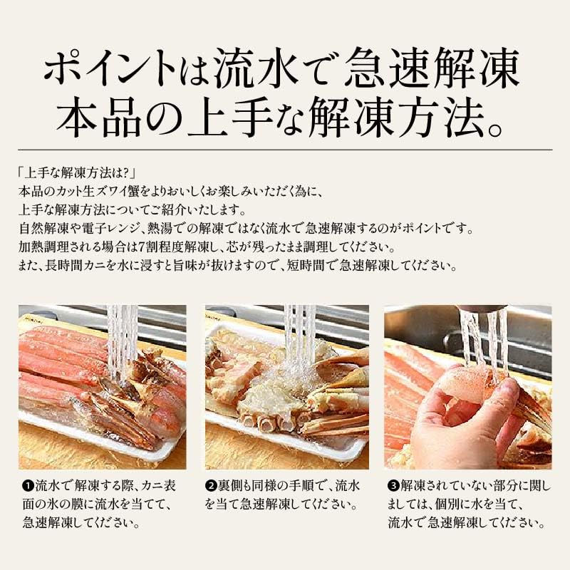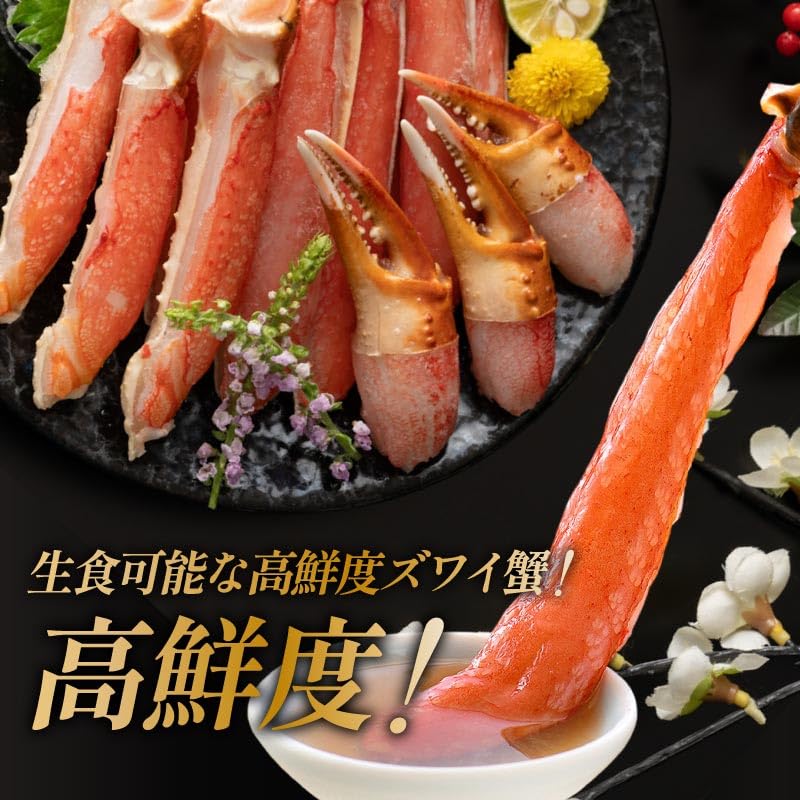 - 【各部位をカット済みだから包丁やハサミも手間も不要】ズワイガニの爪、爪下、足、肩など各部位を食べやすくカットしてありますので、ご家庭で包丁や調理バサミを使用することなく、商品到着後に手間不要でお使い頂けます。カニは好きだけど捌くのが手間…という方はもちろん、贈り物にも喜ばれる商品です。