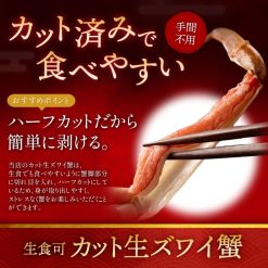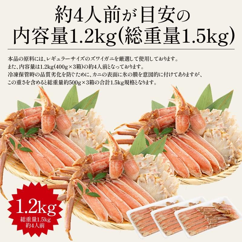 - 【高鮮度でお刺身もOK!カット済み「生ずわい蟹」】お徳用規格の4g(総重量5g)×3箱の約4人前のボリュームとなっております。ご家族や友人など人が集まる時にもお使い頂け、お刺身や蟹鍋、蟹しゃぶ、雑炊に焼き蟹、天ぷらや蟹飯などいろいろな調理方法でお手軽にカニ料理をお楽しみ頂けます。