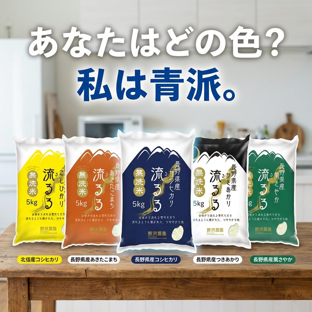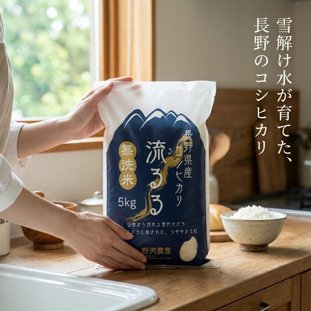 - 【パッケージに意味がある理由】 「流るる」は長野・野沢温泉村の雪解け水をイメージした ブランド名。清流を思わせるデザインはキッチンに置いたまま でも絵になり、「どこのお米?」と聞かれる1袋です。