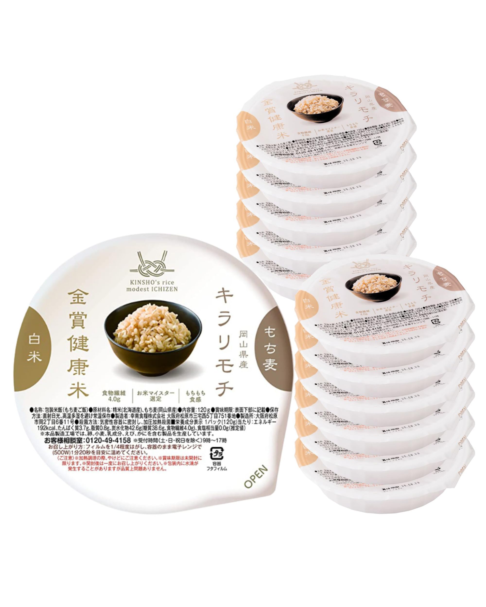 - 【商品仕様】 ● 商品名:金賞の一膳・キラリモチ(岡山県産もち麦) ● 内容量:1パック 120g ● 原材料:キラリモチ:白米(北海道産)、もち麦(岡山県産) ● 保存方法:常温保存(直射日光・高温多湿を避けてください) ● アレルギー:なし ● 製造:日本国内工場 ●賞味期限:賞味期限が45日以上残っているものをお届け致します。