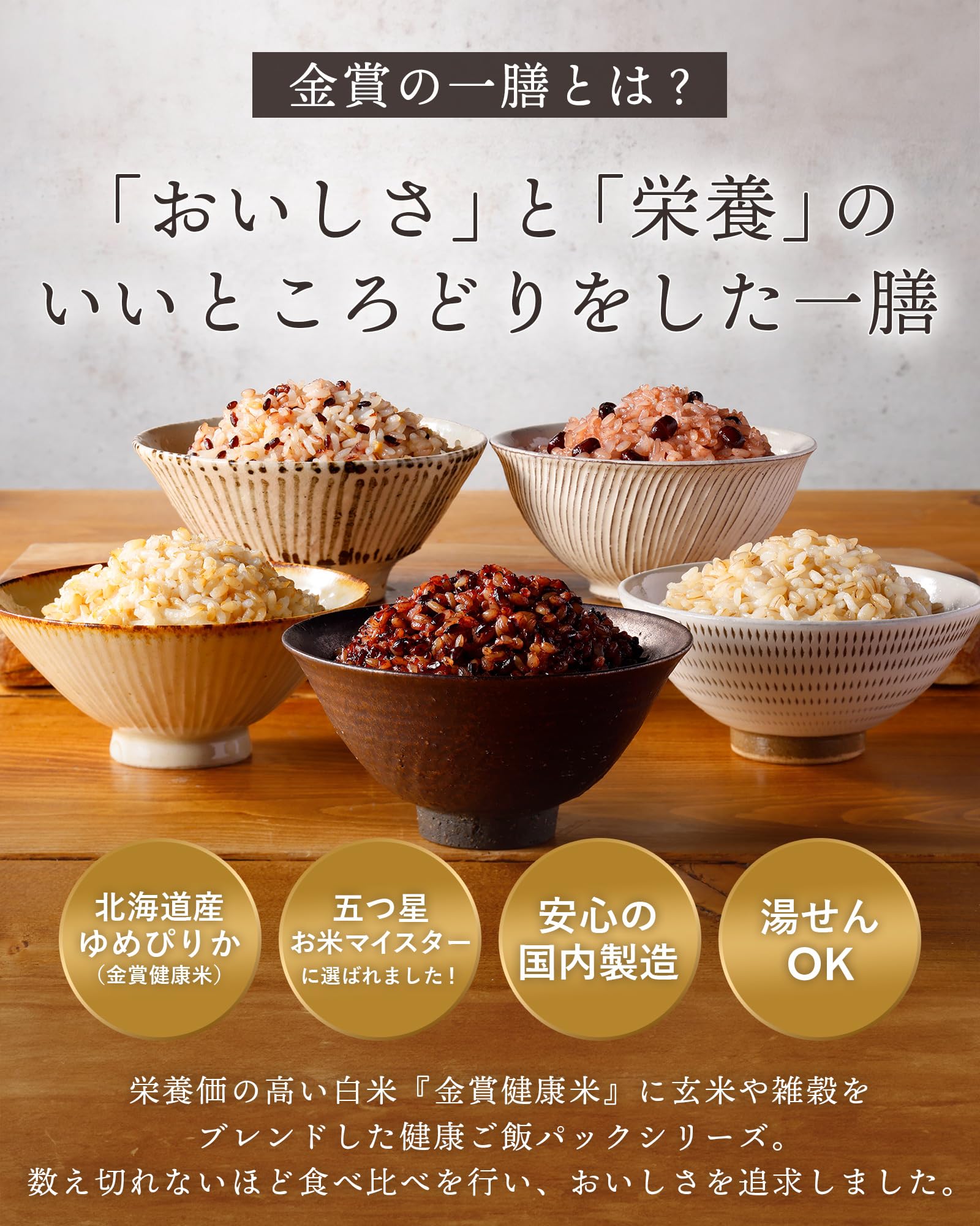 - 【金賞受賞の「金賞健康米」使用】北海道産ゆめぴりかを独自製法で仕上げた「金賞健康米」は、日本米飯管理士協会から金賞を受賞。五つ星お米マイスターが厳選した素材を使った、信頼と実績のレトルトご飯です。
