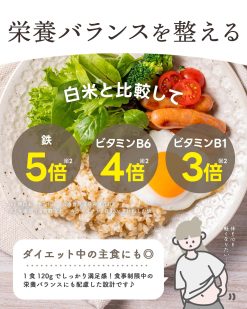 - 【独自製法×大学共同開発】近畿大学農学部と共同開発した独自の「ヘルスキープ製法」により、通常の白米に比べてビタミンEやビタミンB1の残存率が高いのが特徴。創業50年の米飯製造技術と徹底した品質管理で、ふっくら食感と香ばしい風味を実現しました。
