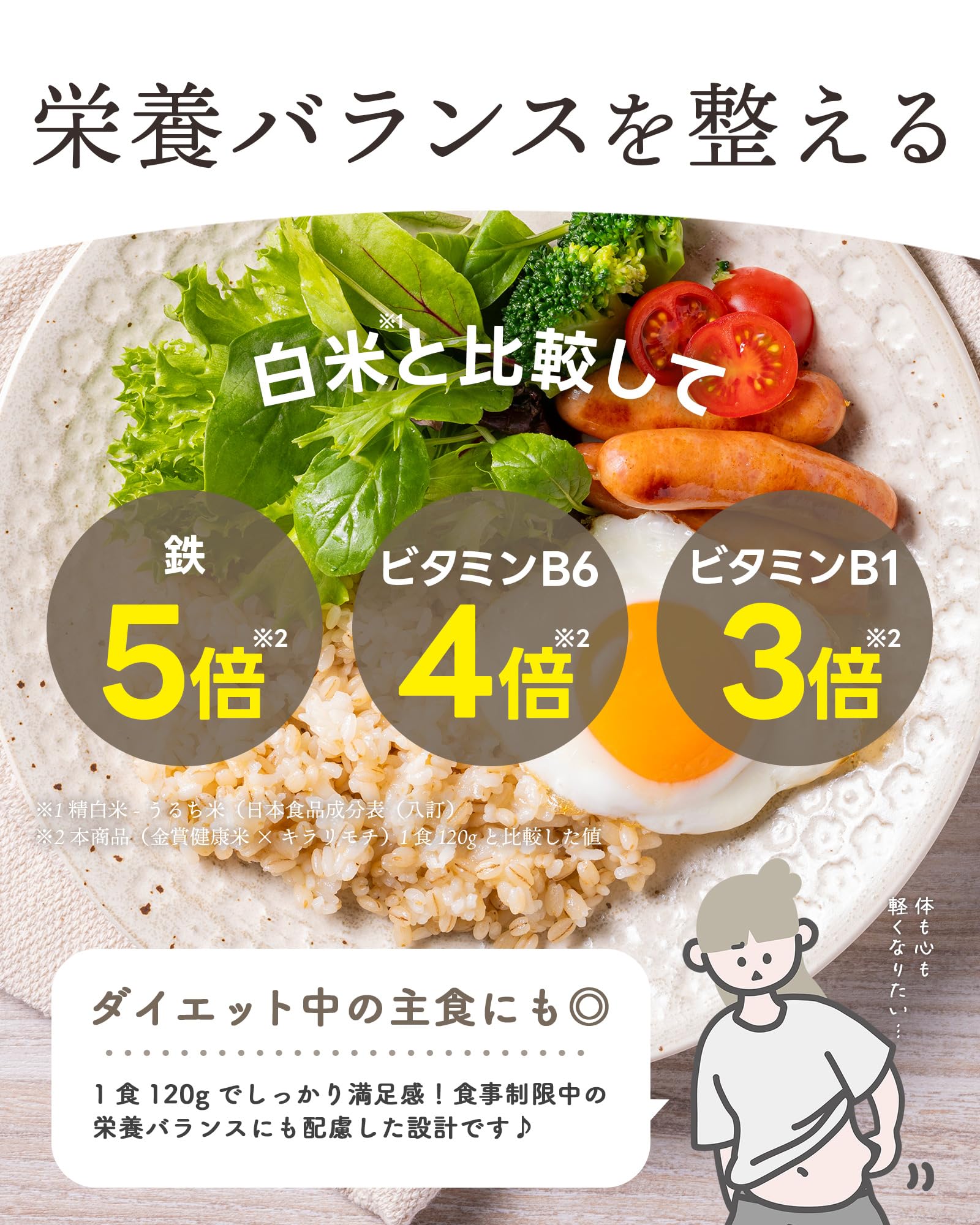 - 【栄養成分表示】 ・内容量:1パック(120g)当たり キラリモチ ・熱量:192(kcal) ・栄養成分表示:たんぱく質(g)3.7 脂質(g)0.8炭水化物(g)42.6(糖質38.6g、食物繊維4.0g)食塩相当量(g)0.0 ※数値は日本食品標準成分表を用いて計算した推定値です。