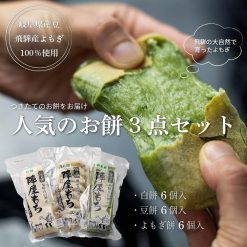 陣屋餅三種 ・新草餅(よもぎ)350g×1袋 原材料:もち米・よもぎ ・白餅 350g×1袋 原材料:もち米 ・まめ餅 350g×1袋 原材料:もち米・大豆・黒豆・青豆・塩 ※よもぎ餅によもぎの茎が入っていることがございますが、召し上がられても品質上の問題はございません。