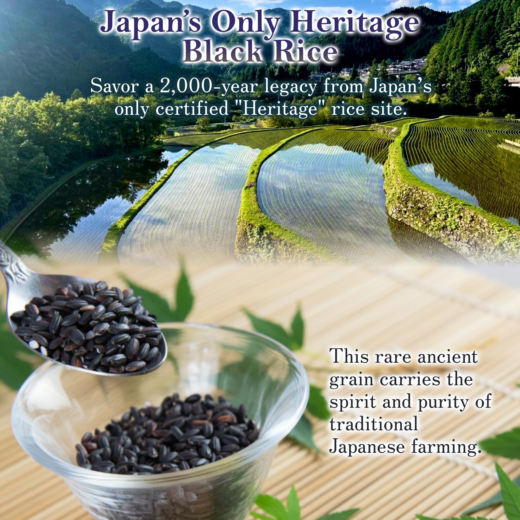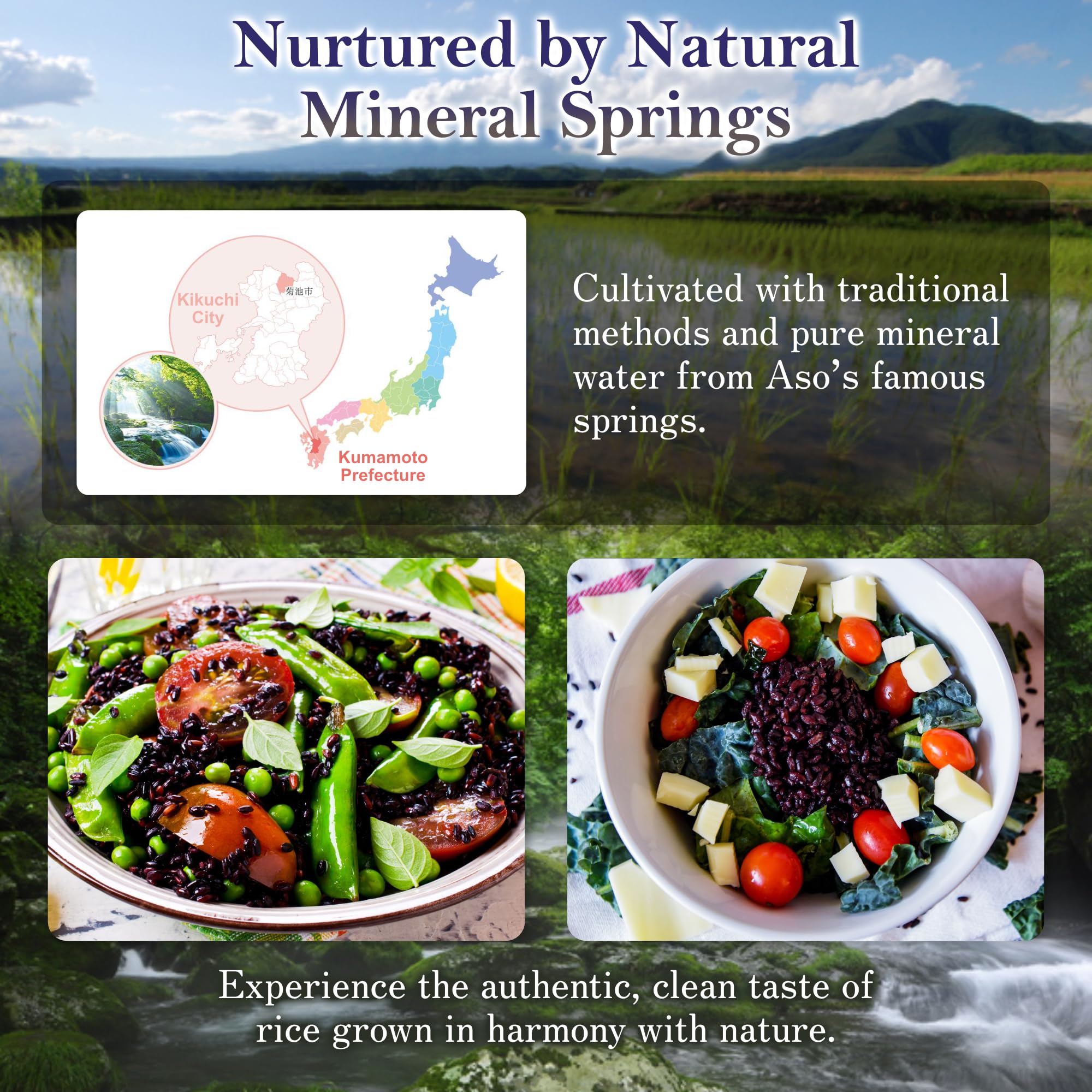 - 毎日食べる御飯だからこそ、阿蘇の伏流水と昔ながらの農法でつくられた黒米です。