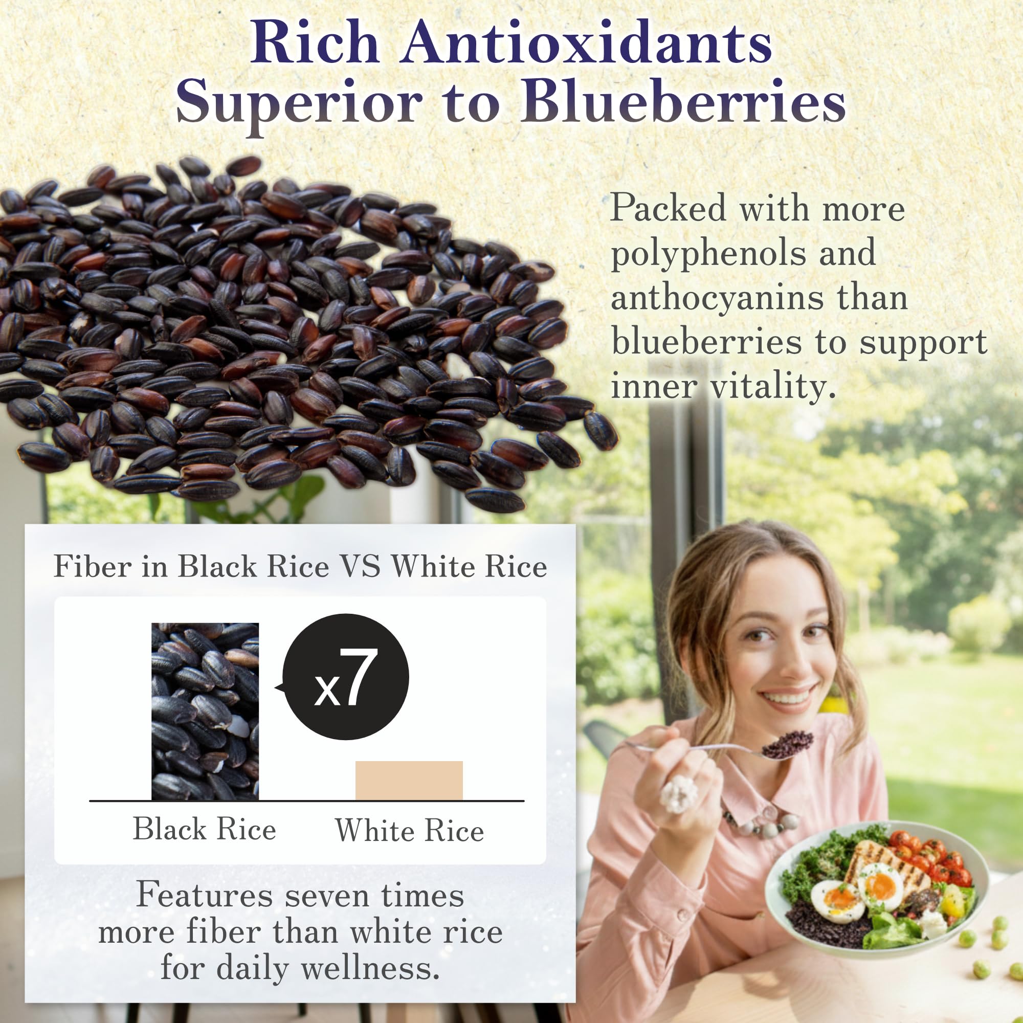食べ方は簡単です。 ① 白米(1合)に黒米(目安大さじ1杯)入れて洗います。 ② 水の量は、いつもの量で大丈夫です。 ③ 炊飯は、早炊きモードでも美味しく召し上がれます。