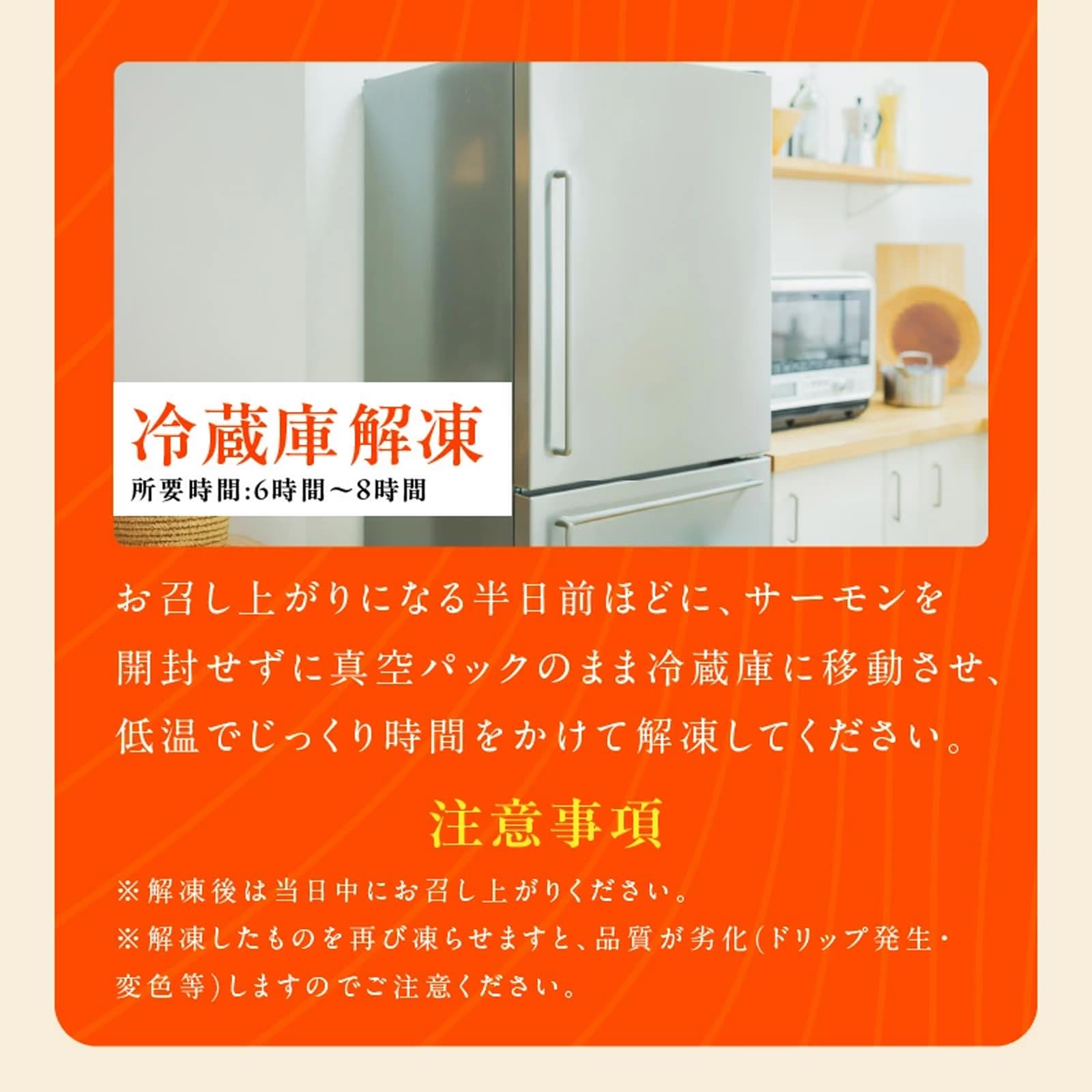 - 大人から子供まで、幅広い人気のサーモン。 弊社ではノルウェーの世界最高水準で育てられたアトランティックサーモンを生のまま空輸で仕入れ、泉佐野市内で加工しております。今回は、その鮮度抜群のアトランティックサーモンを丁寧に手作業で骨抜き、小分け・真空パックし、冷凍しました。 ブロックタイプですので、贅沢に厚切りにしてお刺身で、薄切りにしてカルパッチョ、ダイス状にカットしてサーモン丼など、お好みの厚み・形でお楽しみいただけます。 また、食べきりやすいサイズに小分けしていますので、食べたい分だけを解凍してお召し上がりいただけます。ムニエル・ソテー・フライなど、火を通しても美味しいですが、まずは「生食」で、素材の良さをお楽しみください!