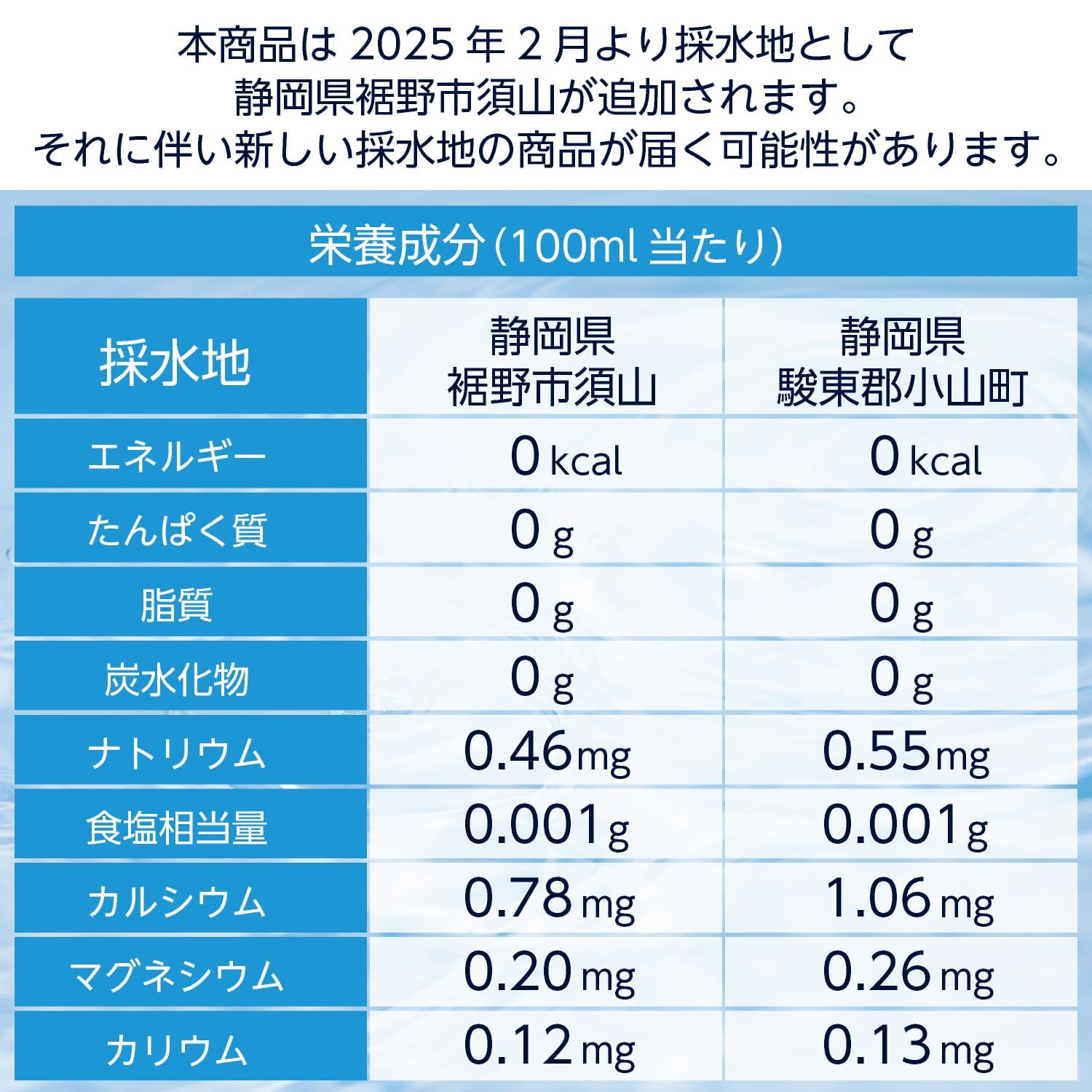 - 商品切り替えに伴い、岐阜・美濃の天然水が届く場合がございます